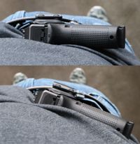 We get a lot of questions asking us what the extension is that hangs off the side of the holster. Well it’s called a concealment claw. It helps hide the grip of the gun by applying pressure to the back side of your pants, which forces the grip closer to the body for better concealment. The picture below demonstrates the holster without (top) and with the claw added (bottom).